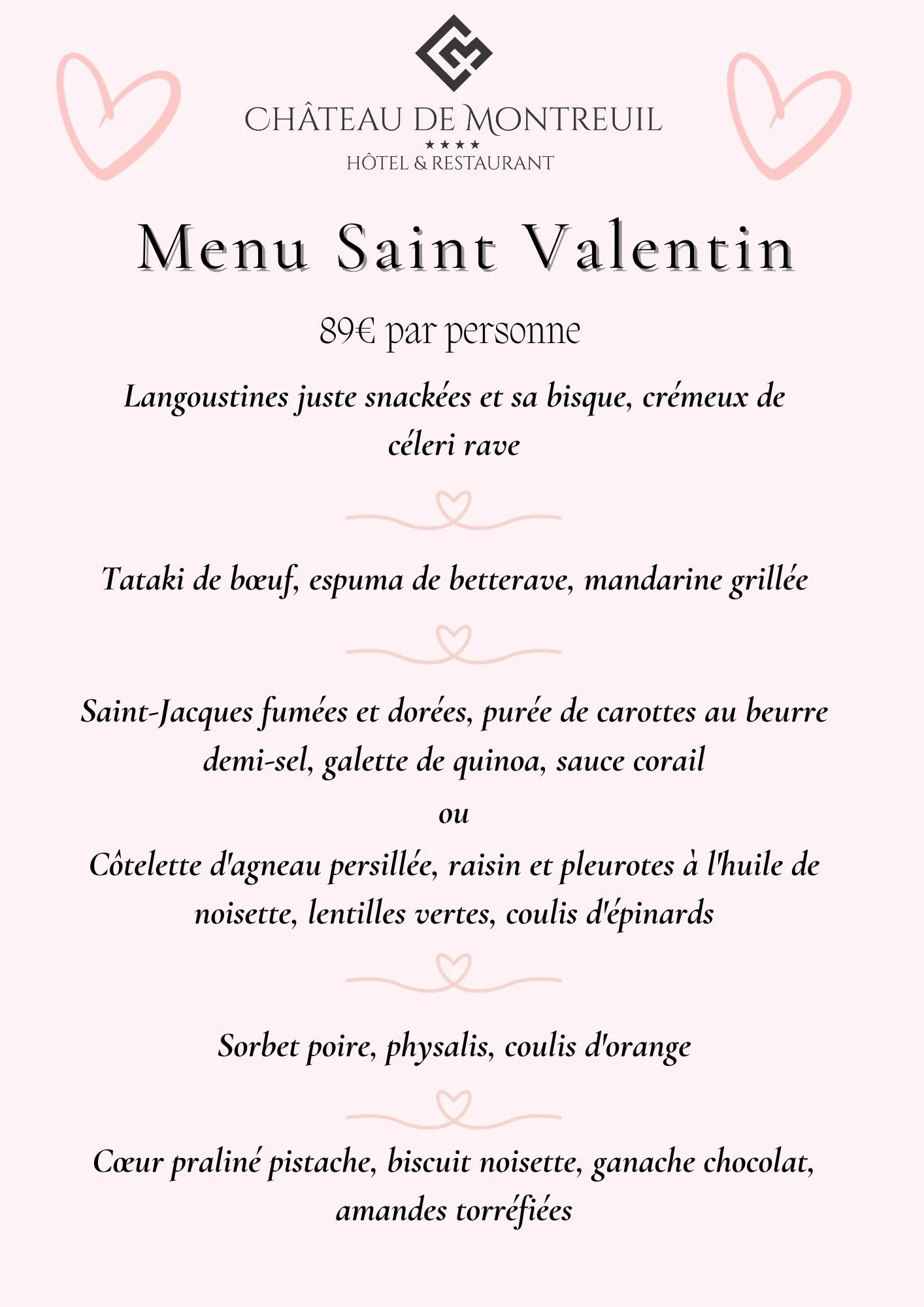 - 2 dîners en 3 services (entrée, plat, dessert, hors boisson) et 2 cafés offerts*