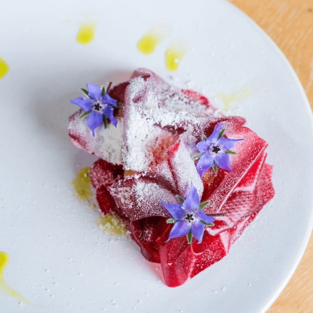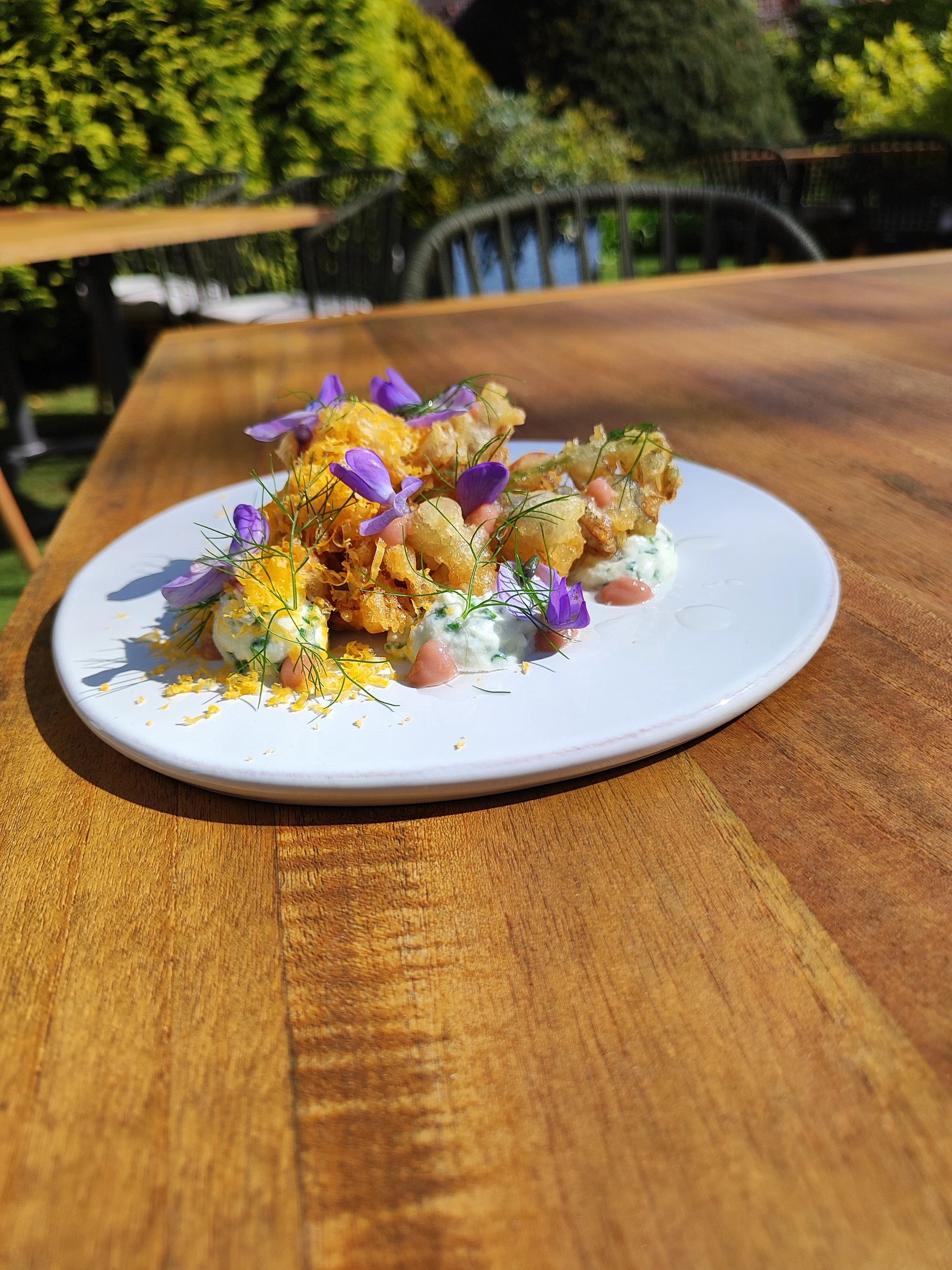 You will eat surrounded by the sound of birdsong, and the waft of flowers from our garden, for you have found a corner of paradise.